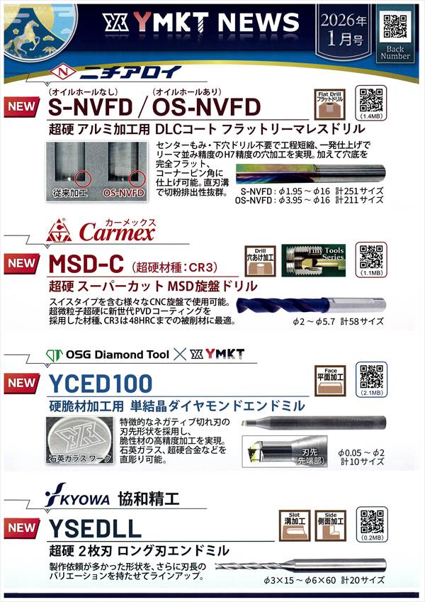 YMKT NEWS 2026年1月号では、ハイス工具を中心とした取り扱いメーカー特集を掲載。